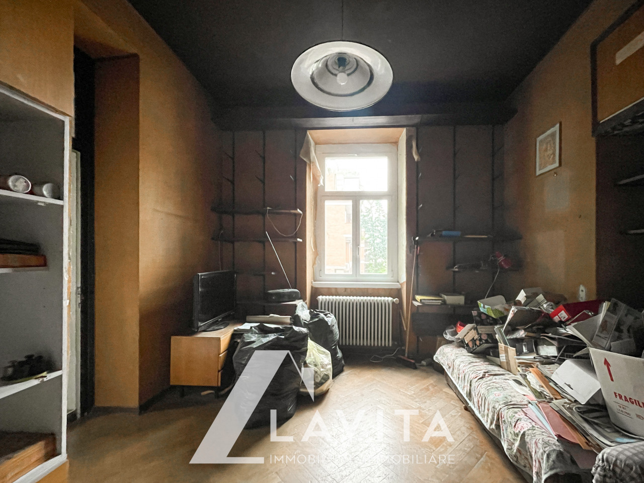 Le stanze presentano soffitti alti oltre i 3 metri, emanando il fascino antico tipico delle costruzioni di quell'epoca. L'appartamento, dotato di due balconi, necessita di un completo restauro interno, tuttavia il pregiato parquet a spina di pesce nelle camere da letto e nel soggiorno merita di essere preservato.