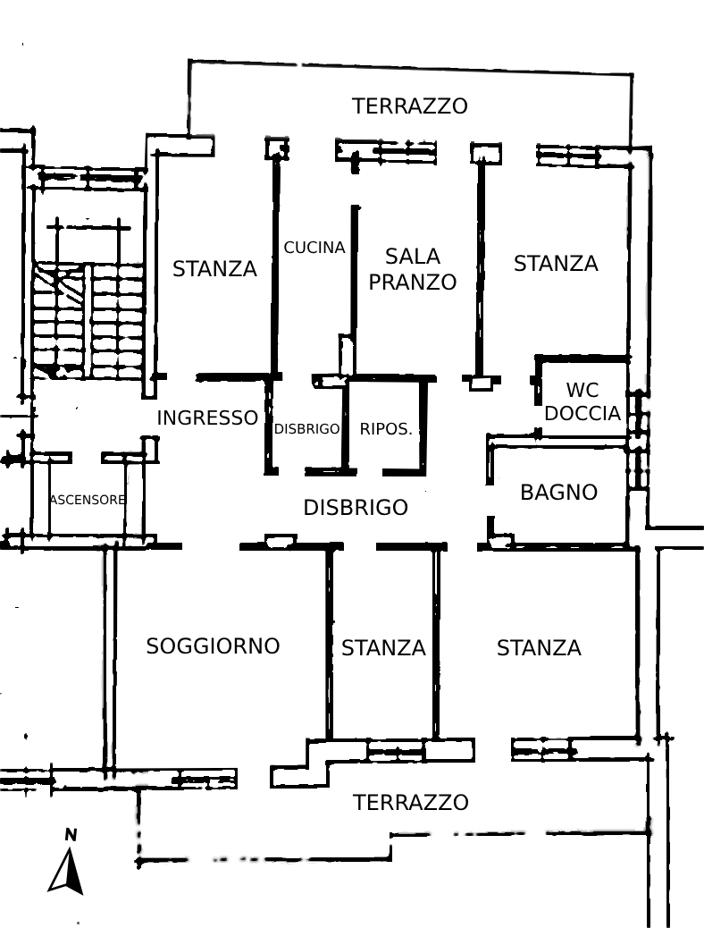 Situato al 4° piano e servito da ascensore (recentemente sostituito ed ampliato) l’appartamento si sviluppa come segue: appena varcata la soglia, si accede a un ampio ingresso che conduce direttamente al soggiorno. Quest’ultimo, di dimensioni molto generose, è dotato di caminetto e si affaccia su una terrazza esposta a sud che si estende lungo tutta la facciata dell’unità.