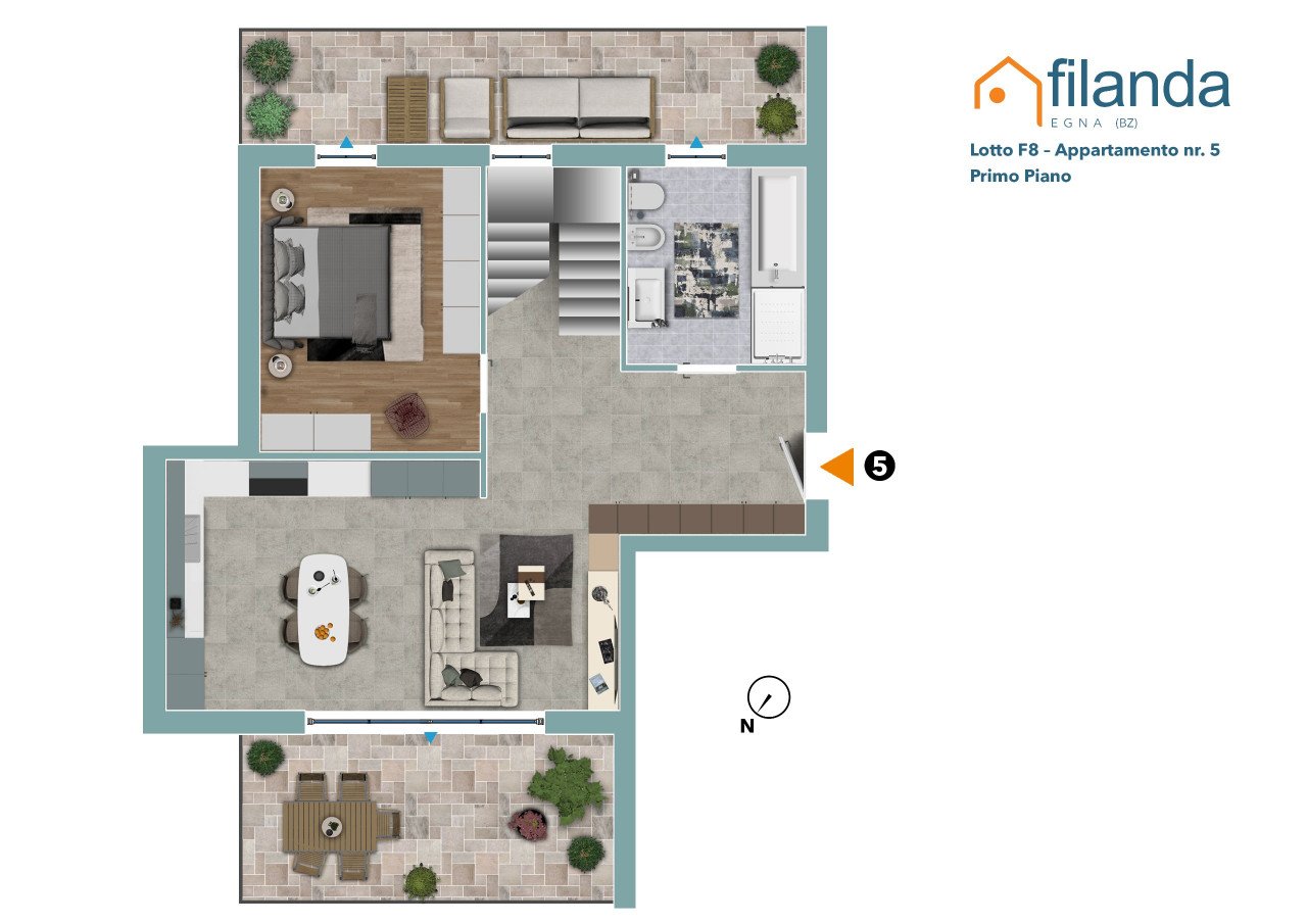 Al primo piano troviamo un ampio ingresso, una luminosa zona giorno con cucina e soggiorno open space con accesso diretto a un grande terrazzo, una camera doppia con uscita su un lungo balcone e un bagno finestrato dotato di vasca e doccia.