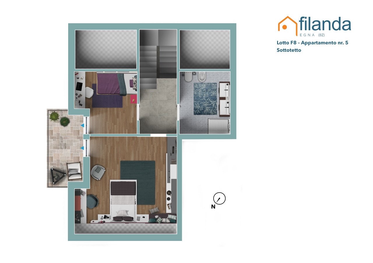 Tramite una scala interna si accede al piano mansardato, composto da una camera matrimoniale con balcone, una camera singola e un bagno finestrato con doccia.