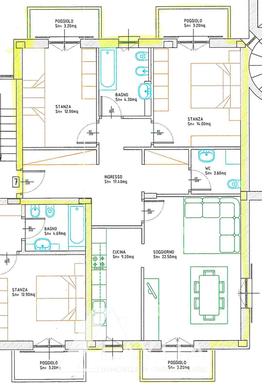 L'appartamento è composto da: ingresso spazioso, soggiorno con balcone, cucina abitabile, due camere da letto, ciascuna con balcone privato, bagno di servizio e bagno principale finestrato con doccia e vasca.