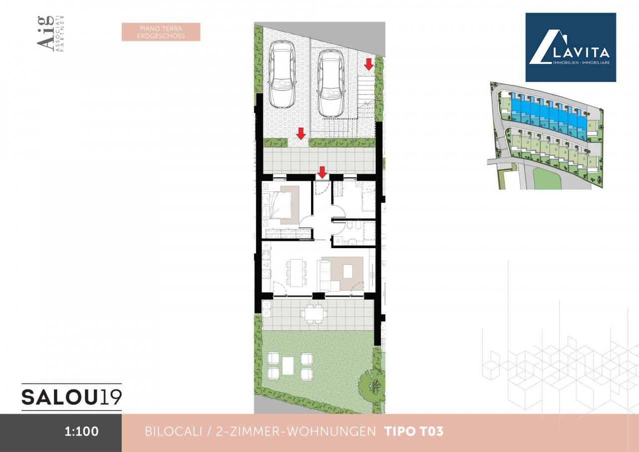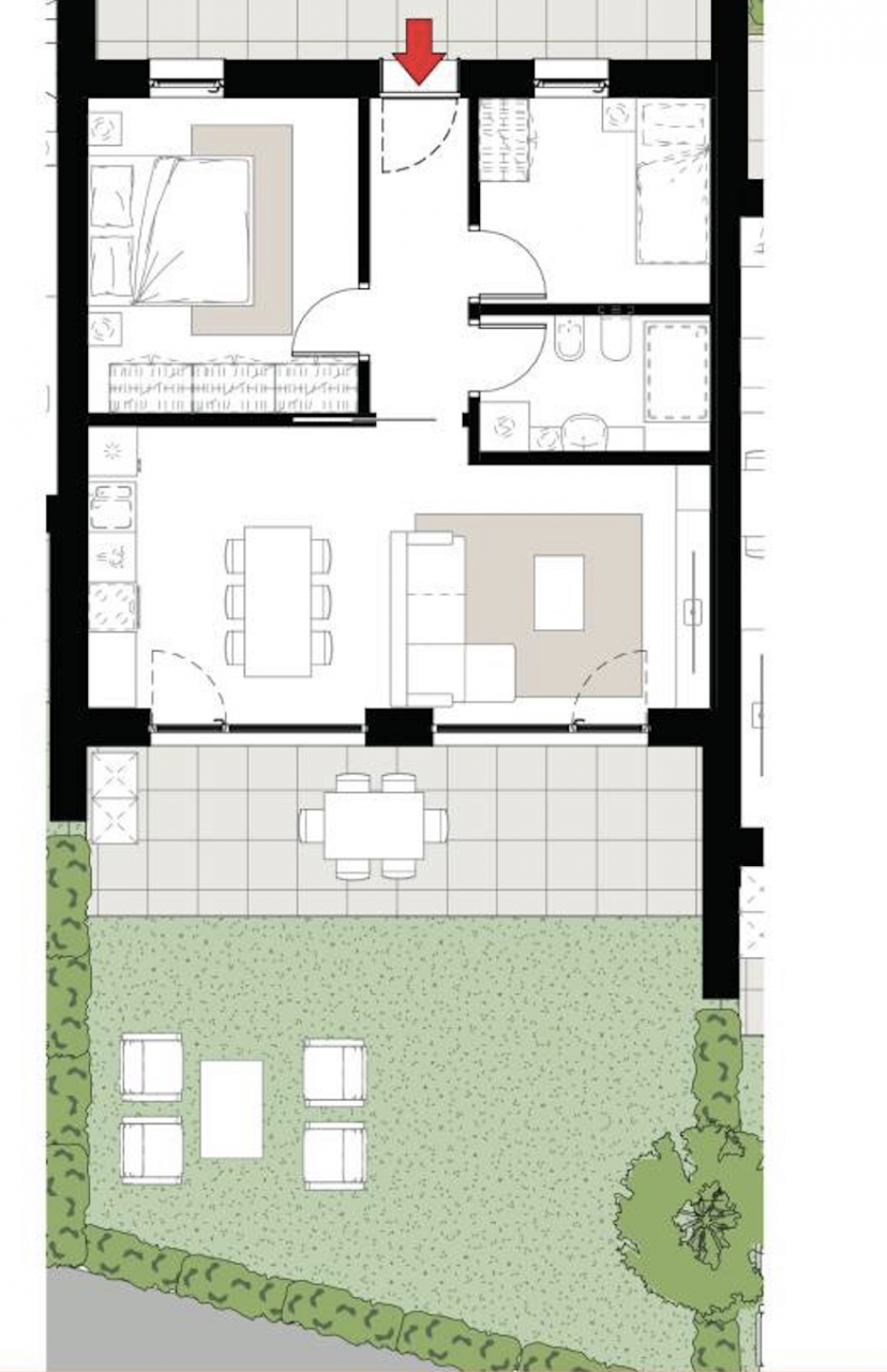 In una zona tranquilla e ben esposta, al piano terra di un edificio con sole 2 unità abitative, proponiamo questo nuovo e ultimo trilocale con giardino. L'appartamento è composto da soggiorno con cucina, 1 camera da letto matrimoniale, 1 camera singola, bagno e giardino privato, ma può ancora essere modificato in base alle proprie esigenze.
