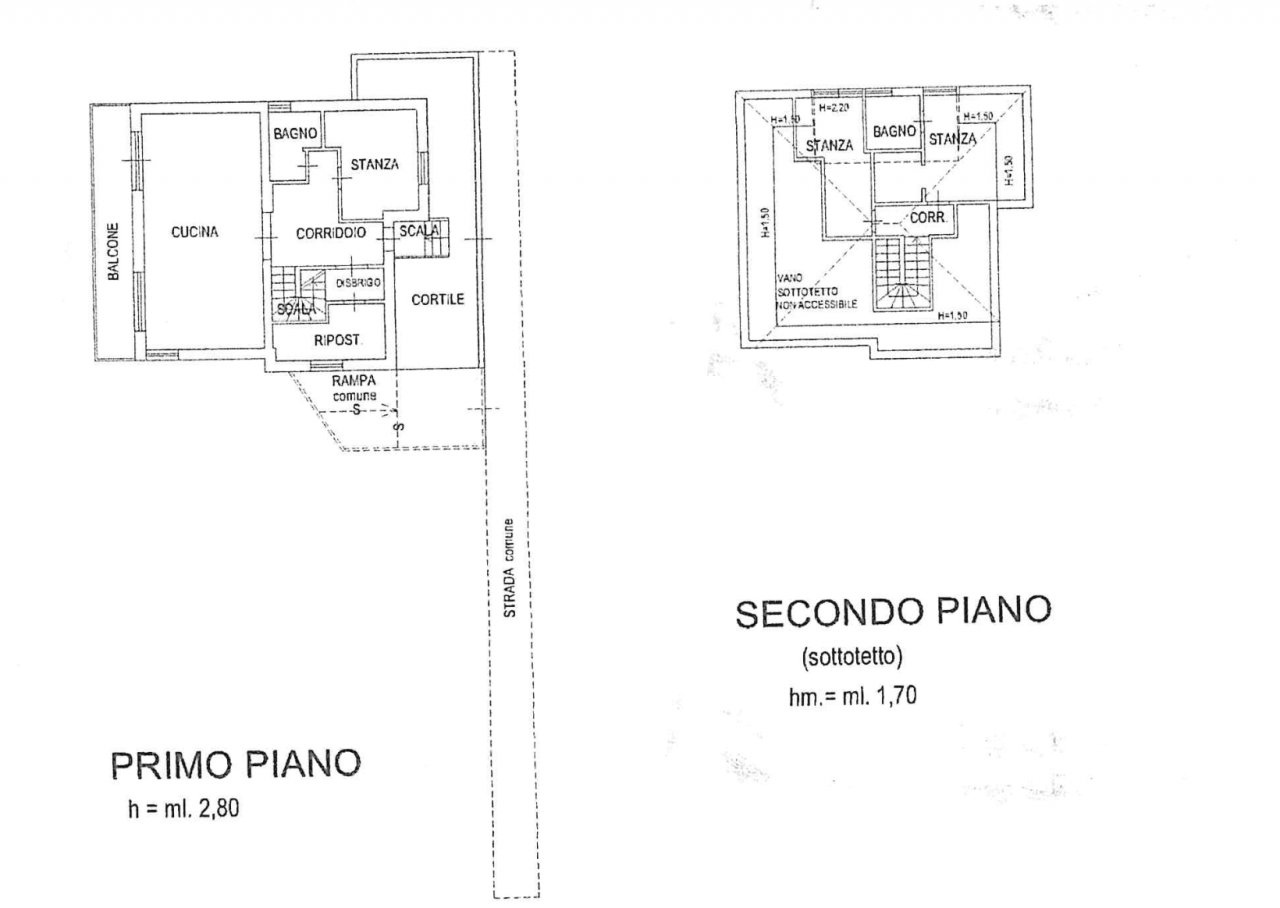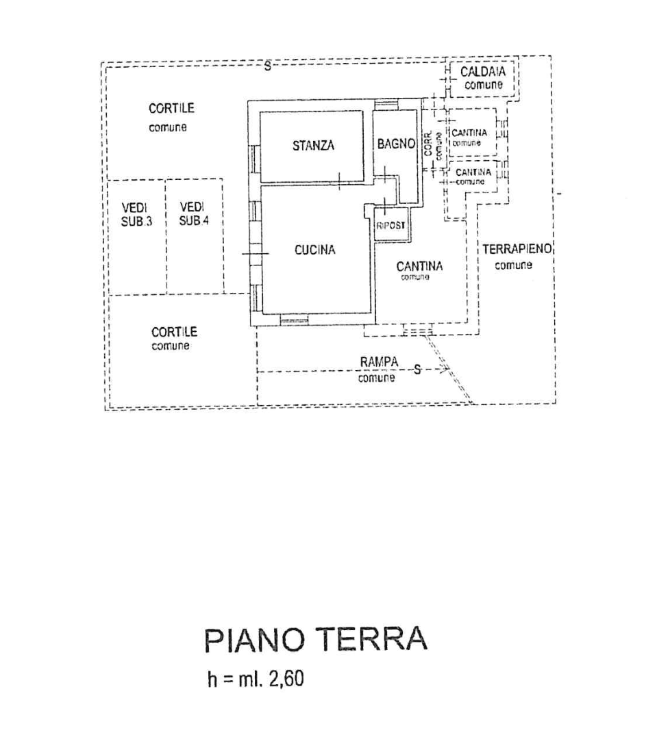 L’immobile si sviluppa su tre livelli. Al piano terra si accede a un primo appartamento bilocale, composto da cucina e soggiorno, una camera matrimoniale, un bagno finestrato con vasca e doccia, e un ripostiglio.