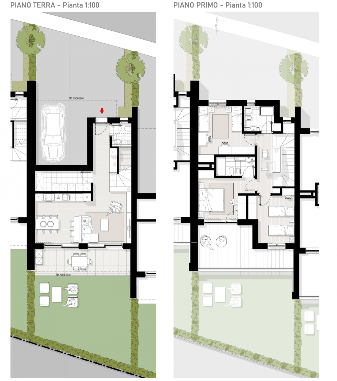 Il progetto si compone di villette monofamiliari orientate sull’asse est/ovest su due piani, ciascuna delle quali studiata su due livelli per dividere l’ampia e luminosa zona giorno al piano terra, dalla suggestiva zona